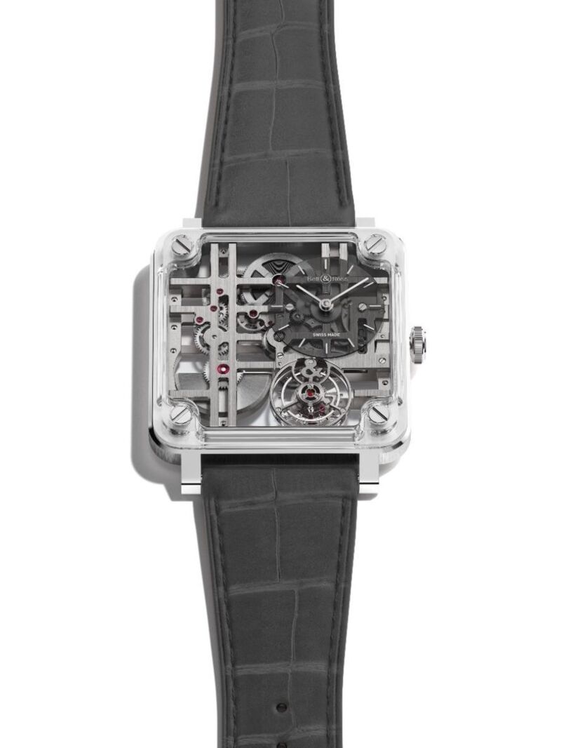 De BR-X3 is opgebouwd rond een strak geometrisch raster, geïnspireerd door abstracte kunst en modernistische architectuur. Rechte lijnen, staalgrijze tonen en de dieprode accenten van 26 robijnen creëren een grafische compositie waarin het skeletwerk volledig tot zijn recht komt. Dankzij een gerookte wijzerplaat blijft de tijdweergave helder, met uren en minuten verschoven naar de positie van 2 uur, terwijl de rest van het horloge gericht blijft op mechanische expressie.