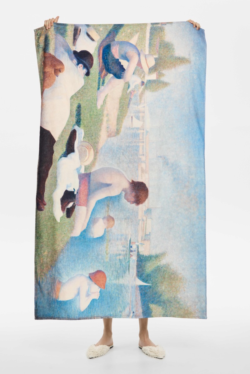 Met frisse kleuren, tactiele prints en gelaagde patronen weet de collectie een hedendaagse interpretatie van klassieke kunst te creëren. Opvallende items zijn onder andere een bedrukte strandhanddoek, een oversized shirt met schilderijfragmenten en een canvas shopper met subtiel verweven verfpuntjes – perfect voor de zomer.