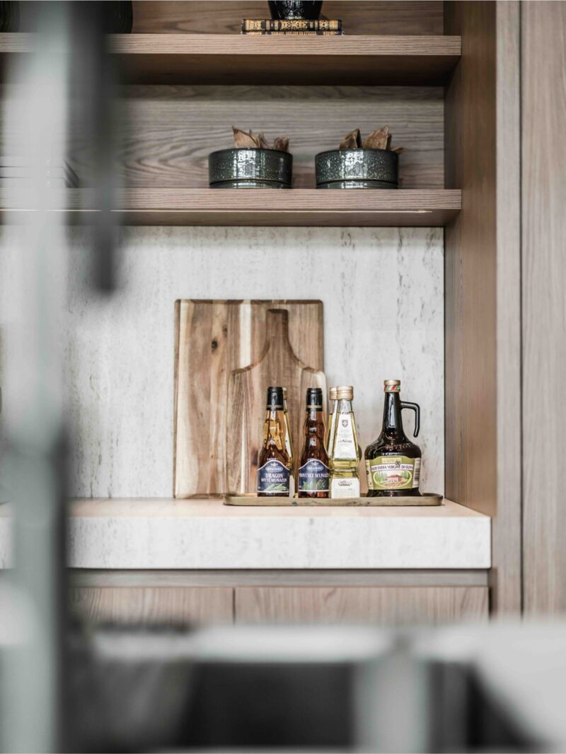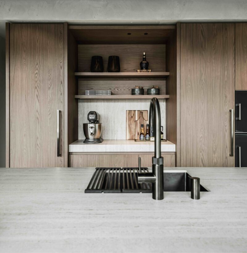 Het werkblad is uitgevoerd in Dekton, met een geïntegreerde Quooker en zeeppomp. Een nis met subtiele LED-verlichting creëert een elegante koffiecorner, terwijl de houtstructuur van de kastfronten en de matte laklaag zorgen voor een rijke, tijdloze uitstraling.