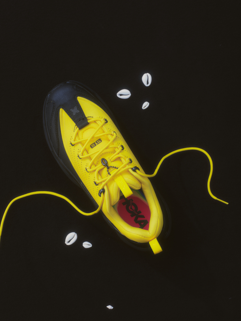 De Spencer Badu Elevon X is uitgevoerd in een gedurfde gele kleur met verfijnde, symbolische details die verwijzen naar Badu’s Ghanese afkomst. De sneaker bevat onder meer: