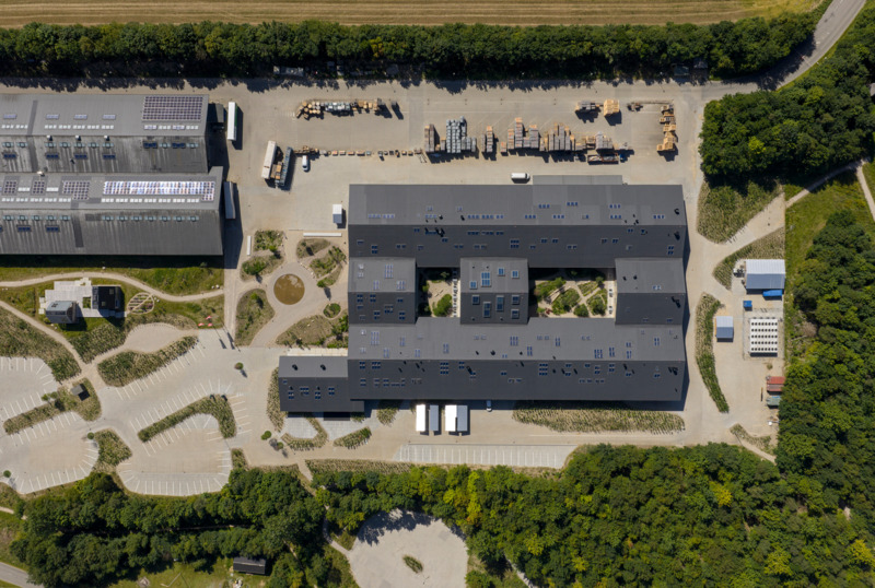 Het LKR Innovation House is ontstaan uit de circulaire transformatie van een industrieel magazijn uit 1995, oorspronkelijk ontworpen door Lars Kann-Rasmussen, zoon van de oprichter van VELUX. Door 55 procent van de oorspronkelijke materialen te hergebruiken, werd 4.576 ton CO₂ bespaard in vergelijking met nieuwbouw. De jaarlijkse uitstoot bedraagt slechts 4,6 kg CO₂e/m², waarmee het gebouw de duurzaamheidsnormen voor 2029 ruimschoots overtreft.
