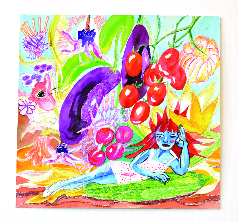 Maar achter die schijnbare vrolijkheid schuilt een confronterende werkelijkheid: de compositie is gebaseerd op een foto van een vrouwenbesnijdenis. Opvallend is dat de vrouw op de voorgrond veel groter is afgebeeld dan de groep mannen achter haar. Door deze verstoorde verhouding krijgt zij een onverwacht overwicht op de mannen, alsof ze de regie over de scène terugpakt. Juist door deze werkwijze - de letterlijke gelaagdheid van materialen en de vervreemdende inzet van vorm en verhouding - wordt ook de inhoud meerlagig: feestelijkheid en gruwel, kwetsbaarheid en kracht, botsen en versmelten in één beeld.